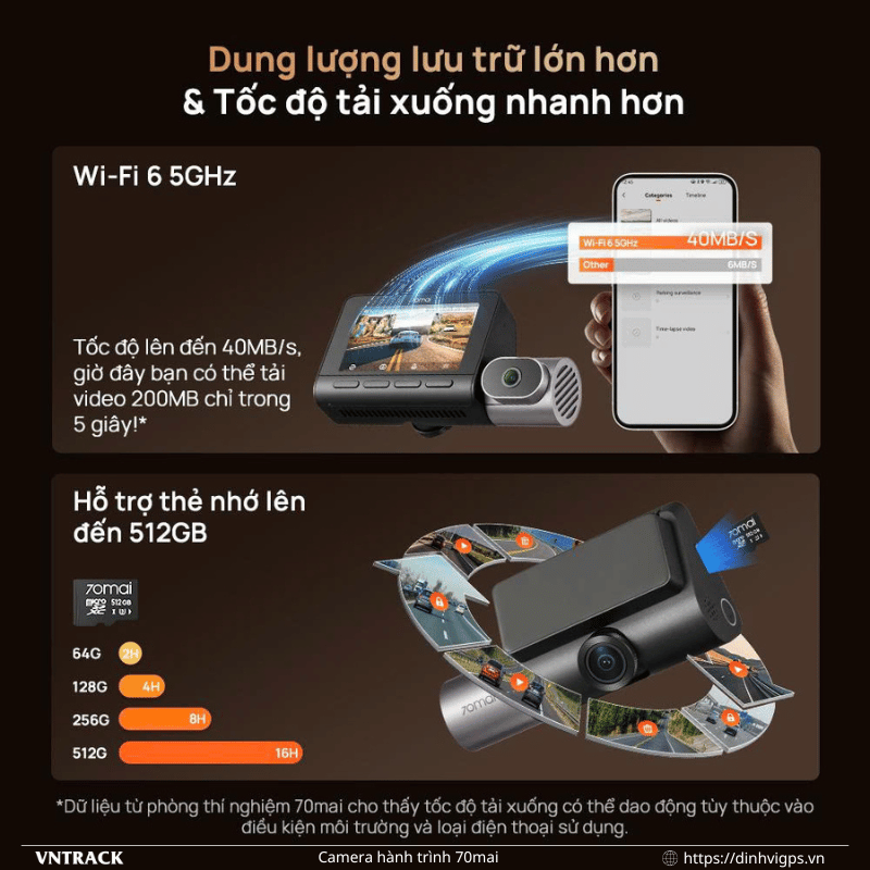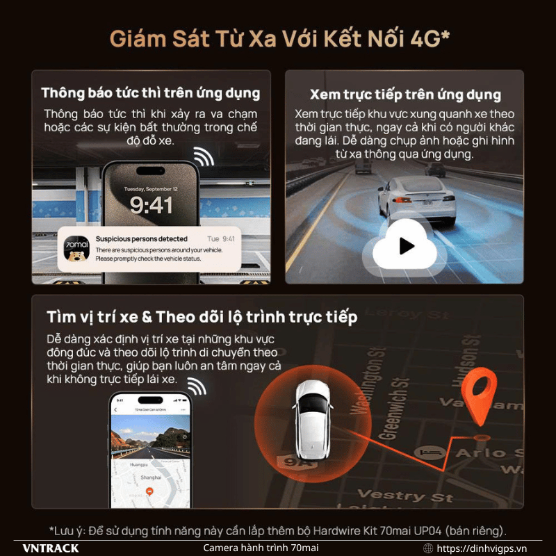 - Kết nối 4G LTE*: Theo dõi và liên lạc với xe mọi lúc, mọi nơi (cần lắp thêm Hardwire Kit 4G 70mai)