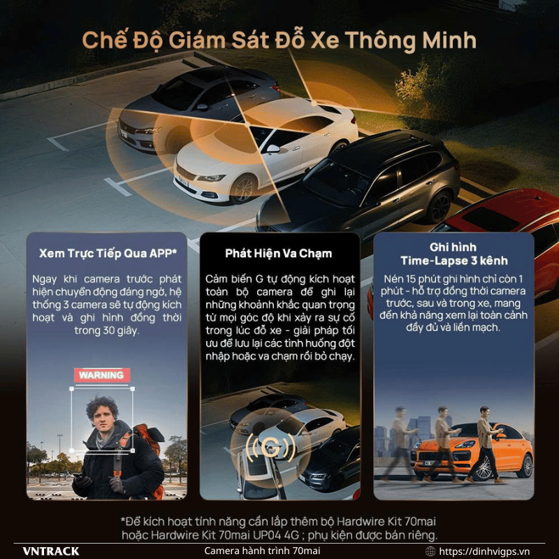 - Giám sát đỗ xe thông minh 3 kênh: Phát hiện chuyển động AI, phát hiện va chạm, ghi hình Time-lapse (*cần lắp Hardwire Kit)