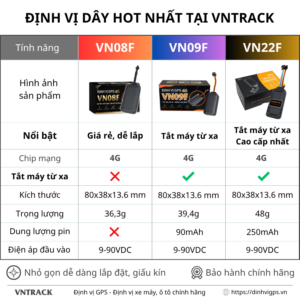 Hiện nay trên thị trường có 3 loại thiết bị định vị xe máy được sử dụng phổ biến nhất, VN08F, VN09F và VN22F. Mỗi dòng thiết bị lại được trang bị những ưu điểm nổi bật riêng, để đánh giá thiết bị nào tốt nhất là tùy theo nhu cầu mỗi người, cùng tham khảo bảng so sánh dưới đây: